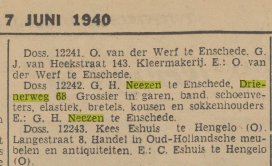 Neezen G.H. grossier Drienerweg 68 krantenbericht 7-6-1940