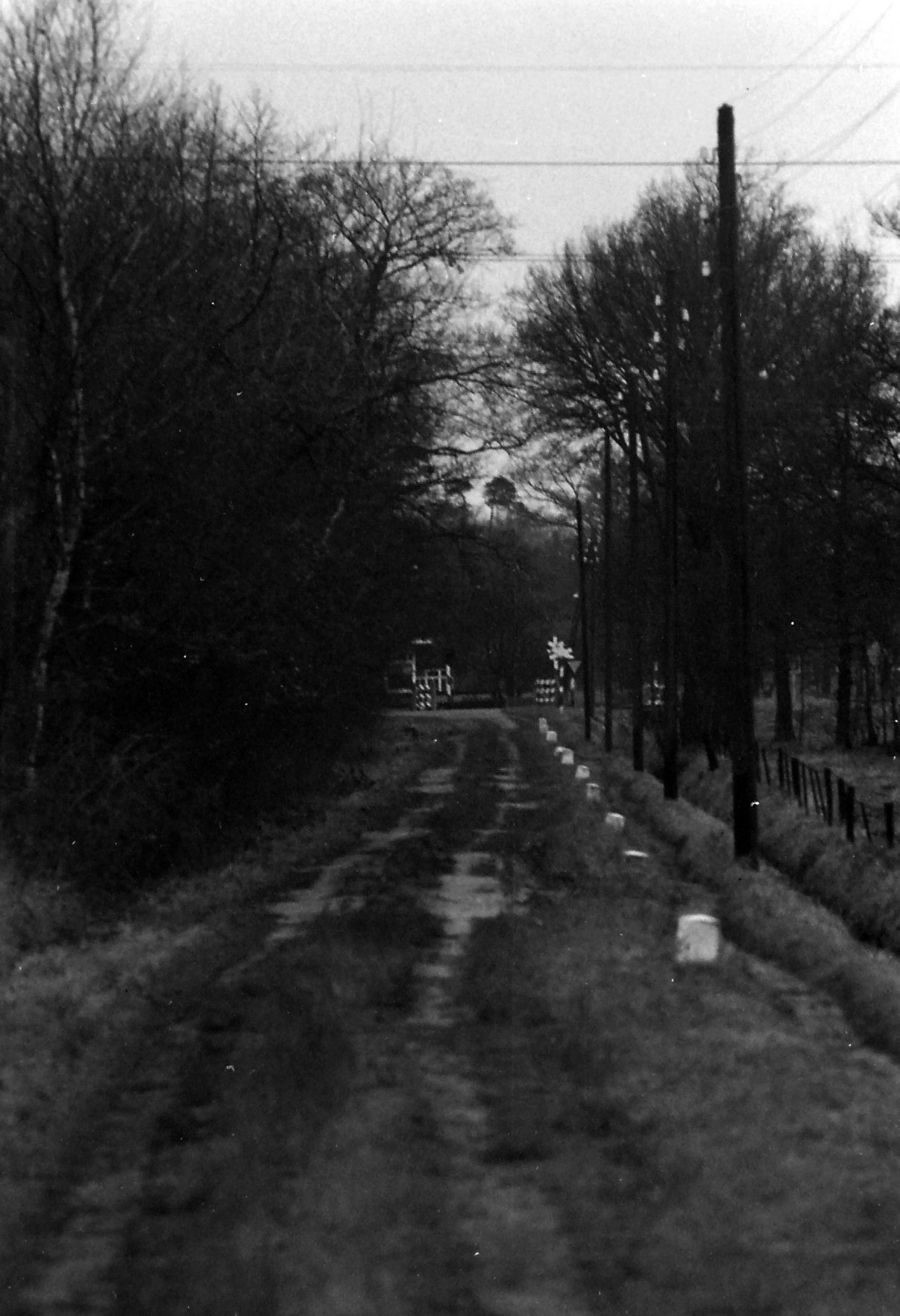 Foto van de goederenspoorlijn naar Boekelo. 1970 ongeveer. je ziet de lijn zelf niet, maar wel de spoorwegovergang in de Geerdinkszijdeweg. Nog bovengrondse bekabeling voor de huizen, de lijnen die hoger liggen zijn van de 110kV leiding die net na die overgang een bocht maakt naar wat nu een industriegebied is. De grote rode pijl op het kaartje geeft de richting van de foto weer, de blauwe lijn ongeveer de ligging van de Afinkstraat.
