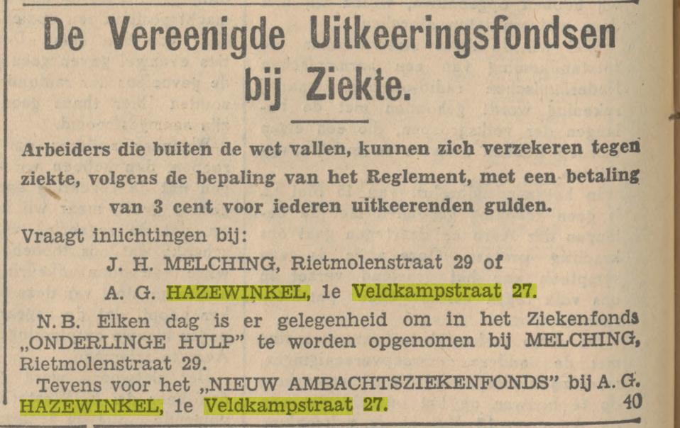 Hazewinkel A.G. verzekeringsagent eerste Veldkampstraat 27 advertentie 8-9-1930