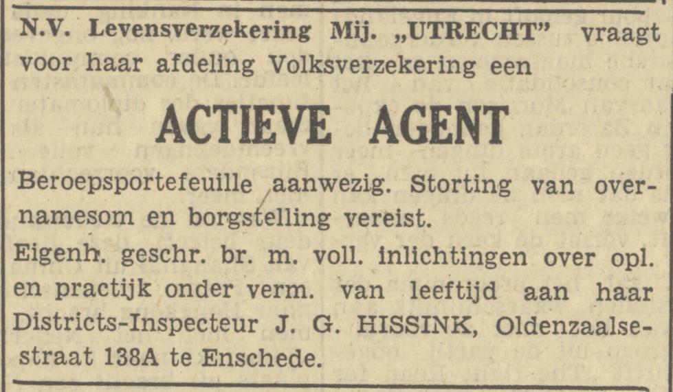 Hissink, J.G. Insp. N.V. Levensverz.Mij.Utrecht, Oldenzaalsestraat 138a