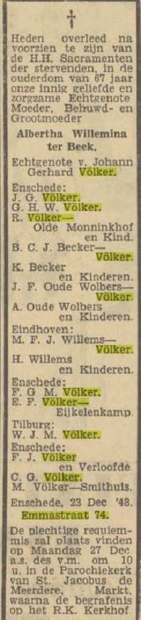 Emmastraat 74 A.W. Völker-ter Beek overlijdensadvertentie Tubantia 29-12-1948.jpg