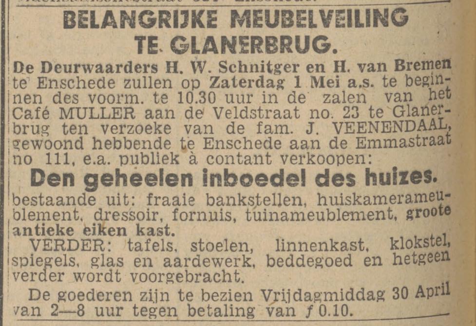 Emmastraat 111 J. Veenendaal advertentie Twentsch nieuwsblad 28-4-1943.jpg