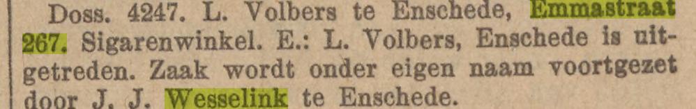 Wesselink J.Joh. verzekeringsagent, sigarenw. Emmastraat 267 krantenbericht 30-11-1927