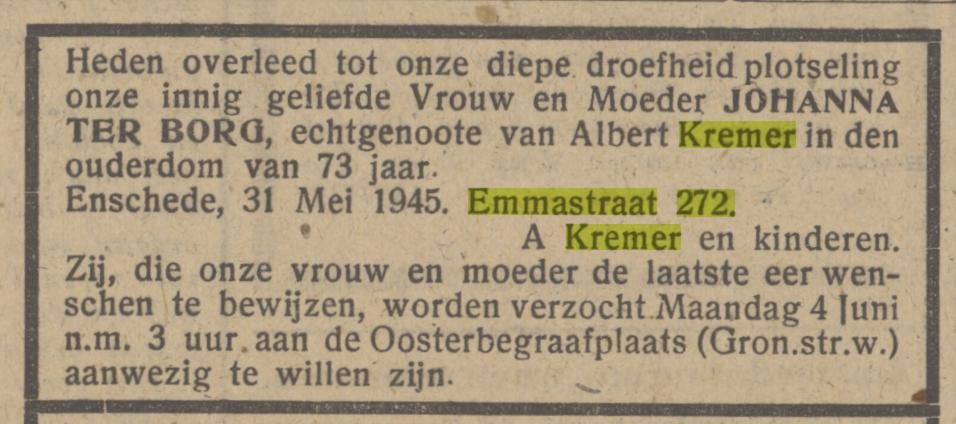 Kremer A. Emmastraat 272 advertentie 1-6-1945