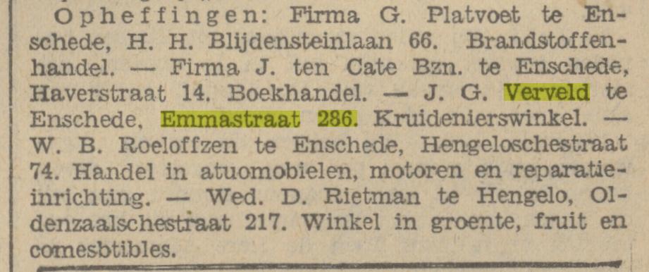 Verveld Joh.G. metaaldraaier, kruidenier Emmastraat 286 krantenbericht 2-5-1929