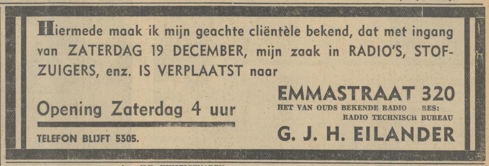 Eilander G.J.H. Radiotechnischbureau Emmastraat 320 advertentie 9-12-1936
