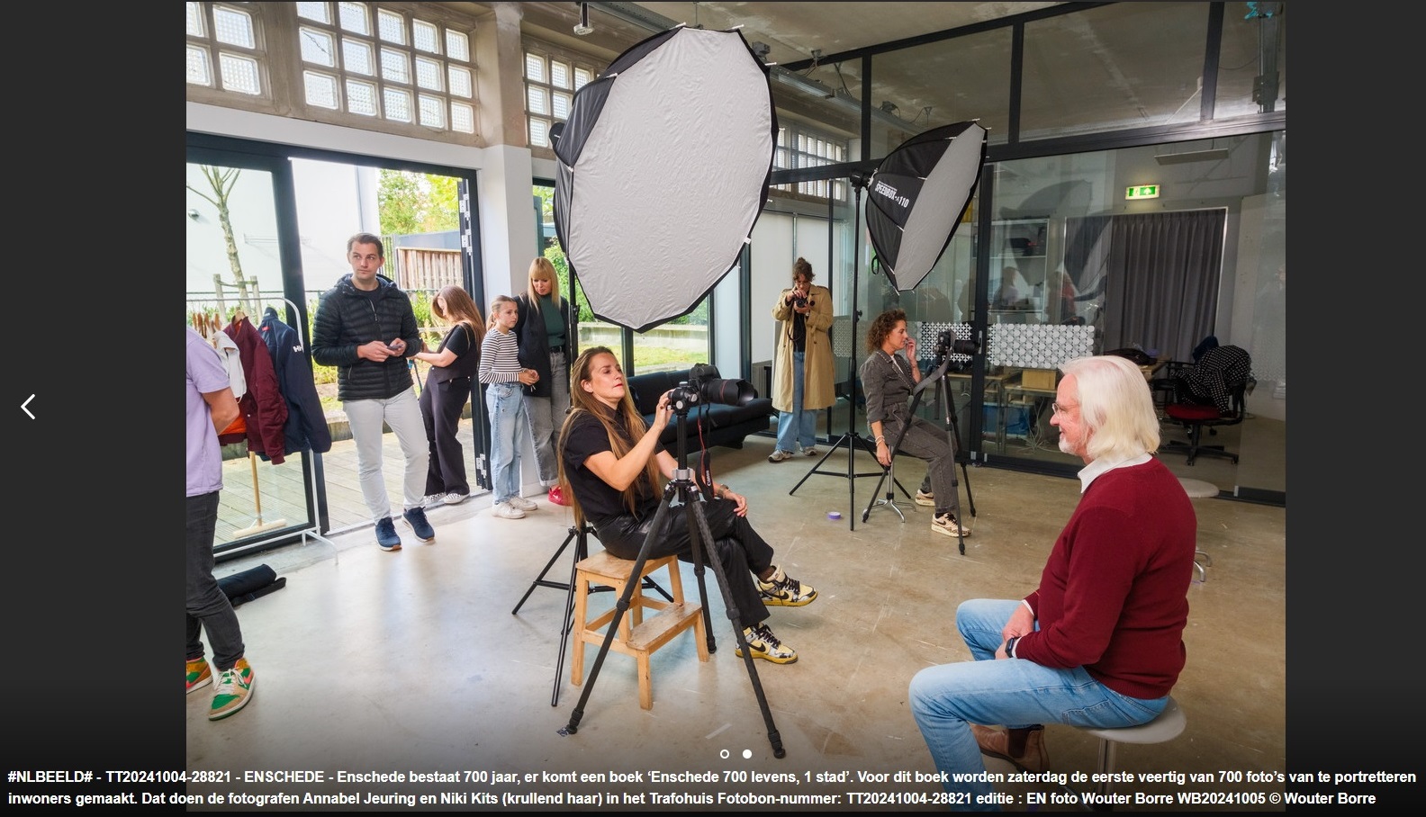 #NLBEELD# - TT20241004-28821 - ENSCHEDE - Enschede bestaat 700 jaar, er komt een boek ‘Enschede 700 levens, 1 stad’. Voor dit boek worden zaterdag de eerste veertig van 700 foto’s van te portretteren inwoners gemaakt. Dat doen de fotografen Annabel Jeuring en Niki Kits (krullend haar) in het Trafohuis Fotobon-nummer: TT20241004-28821 editie : EN foto Wouter Borre WB20241005 ©