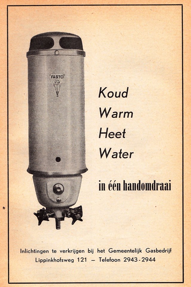 Precies dezelfde geiser (toen geijser) hing bij ons in de keuken. Maar nog niet als keukengeiser boven de gootsteen, want die kwam veel later. Deze hing naast de schouw waaronder (nog korte tijd) de kachel stond waarop werd gekookt. Drie maal 3 ringen. Daarna kwam het gasfornuis met vier kookpitten én een waakvlammetje in het midden.