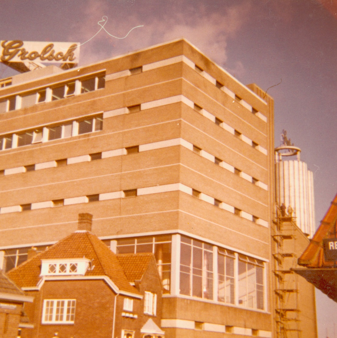 Hierbij nog een foto uit het gemeentearchief met als beschrijving: Grolsch fabriek in de jaren 60. Op de voorgrond kantoor/huis van directeur de Groen. Eerst stond daar achter dit huis een klein schuurtje waar gebrouwen werd. Later werd de fabriek er vlak langs gebouwd, dat was het eerste stuk. De witte cilinders zijn silo’s. Links puntje van dak van groentewinkel van Van der Zee. Dit is Reumerschoolstraat, een klein straatje, er stonden maar elf woningen. Deze straat bestaat niet meer.