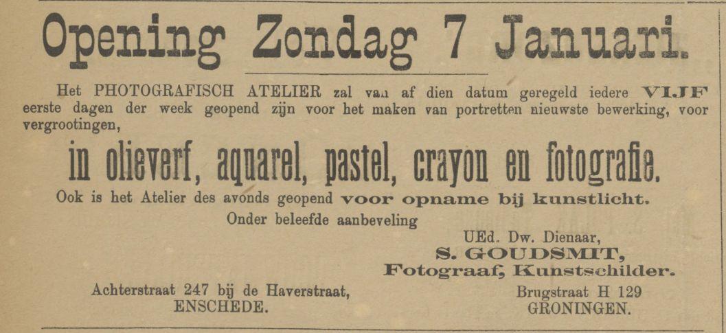Op nr. 247 van de Achterstraat was ook een fotografisch atelier van Salomon Goudsmit. Van deze fotograaf is ook een foto opgenomen in de beeldbank van het gemeentearchief (zie onderstaande foto). Het betreft een foto van een versierde poort gemaakt ter ere van koninklijk bezoek. Ik vraag mij af of deze foto wel in Enschede is gemaakt, omdat de fotograaf Goudsmit ook een atelier had in Groningen, zoals blijkt uit de onderkant van de foto en ook uit bijgaande advertenties.