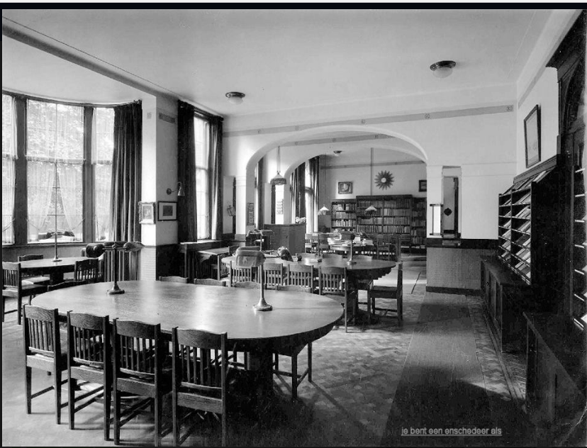 Het huis is na de oorlog niet weer opgebouwd. Hierbij een foto van het interieur, de leeszaal toen het bibliotheek was.
