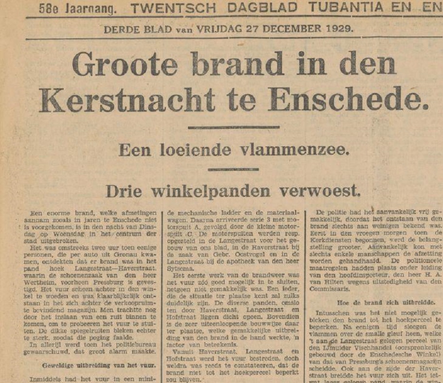 Haverstraat hoek Langestraat brand kerstnacht krantenbericht Tubantia 27-12-1929