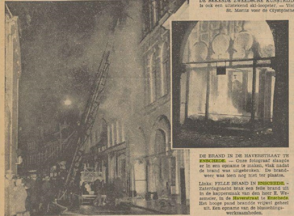 Haverstraat brand kapperszaak E. Wesemeier krantenfoto Tubantia 6-1-1936.