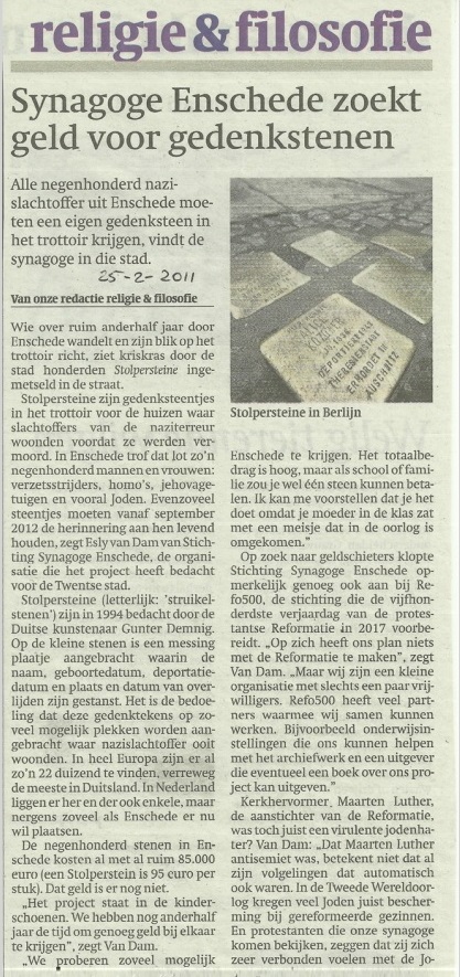 Synagoge Enschede zoekt geld voor gedenkstenen krantenbericht 25-2-2011
