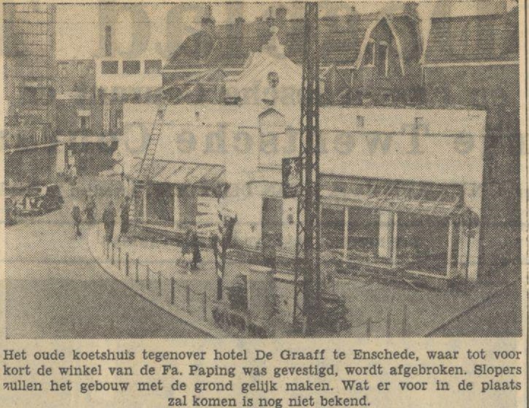 Kruispunt De Graaff sloop winkel Fa. Paping krantenfoto Tubantia 10-7-1951