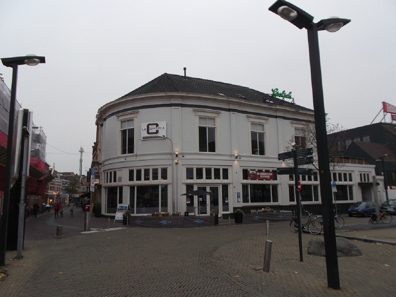 Café-restaurant Royal aan de Hengelosestraat hoek Stationsplein in 1933 en in 2013 Forum café aan de Korte Hengelosestraat hoek Stationsplein.