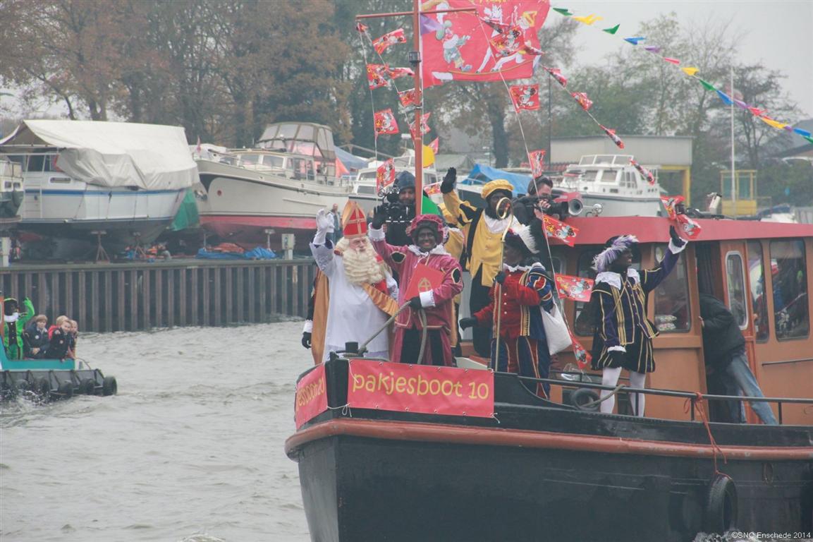 In Enschede arriveert de goedheiligman zaterdag traditiegetrouw per boot. Hij vaart, als alles volgens plan verloopt, rond 11.00 uur de haven binnen. Meer dan honderd pieten varen met hem mee. Nadat hij is afgemeerd en toegezongen door de kinderen die hem daar opwachten, gaat hij naar de binnenstad. Daar maakt hij rond 12.45 uur zijn opwachting.