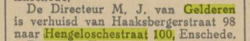 Da Fam. Van Gelderen is dus in 1924 verhuisd van de Haaksbergerstraat 98 naar de Hengelosestraat 100 volgens dit krantenbericht uit de Tubantia van 1-8-1924.