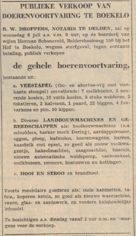 Schoneveld H .landbouwer Beldershoekweg 100 advertentie 2-7-1970
