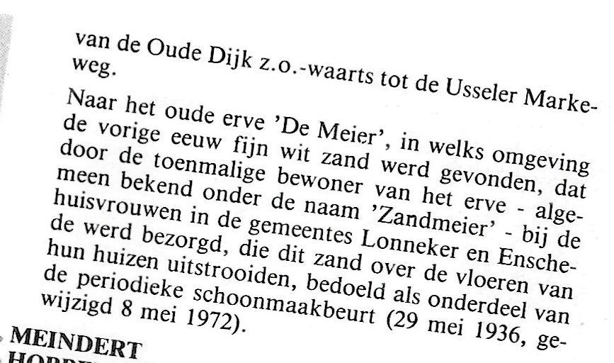 Wel wordt de Meierweg vermeld in het straatnamenboekje hondervijfenzeventig jaar straatnamen in Enschede van J. van Ooyik met vermelding dat deze straat loopt van de Oude Dijk tot de Usselermarkweg. Volgens onderstaand krantenbericht van 12-4-1970 is een deel van de Meierweg toen gesloten i.v.m. aanleg van het sportveldencomplex Wesselerbrink Zuid aan de Geessinkweg.