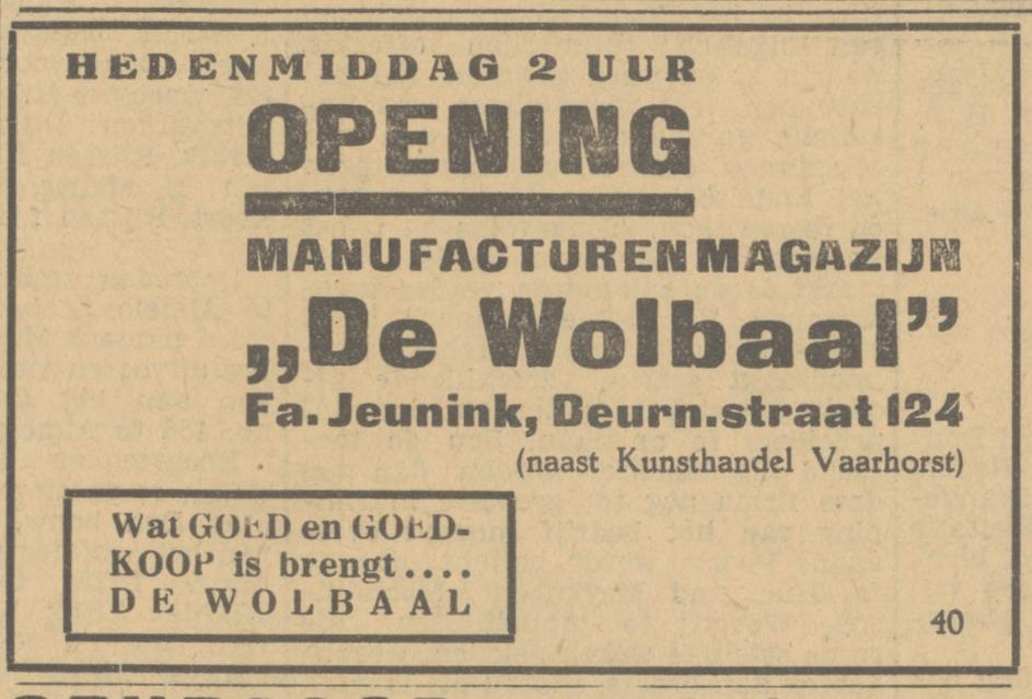 Jeunink-Nieuwenhuis, Fa., Mag. De Wolbaal, Deurningerstraat 124.