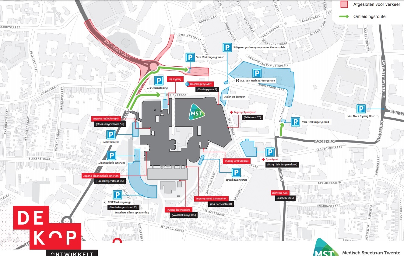 De hoofdroute naar de spoedpost en de parkeergarage is via de Kuipersdijk. Komt u iemand ophalen of wegbrengen? De hoofdingang kunt u bereiken via de Haaksbergerstraat. Vanaf de Haaksbergerstraat mag u rechtsaf de Koningstraat op. Terug gaat u via de Beltstraat. De parkeergarages H.J. van Heek inrit West en Zuid zijn beide bereikbaar. De rotonde Ripperdastraat – Zuiderval is afgesloten voor verkeer. Volg de singels en rijd via de Haaksbergerstraat of Kuipersdijk naar het MST.