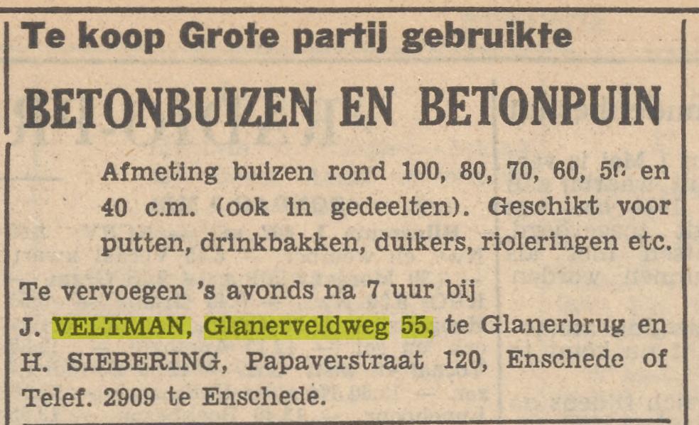 Veltman Joh. grondwerker Glanerveldweg 55 advertentie 2-5-1953