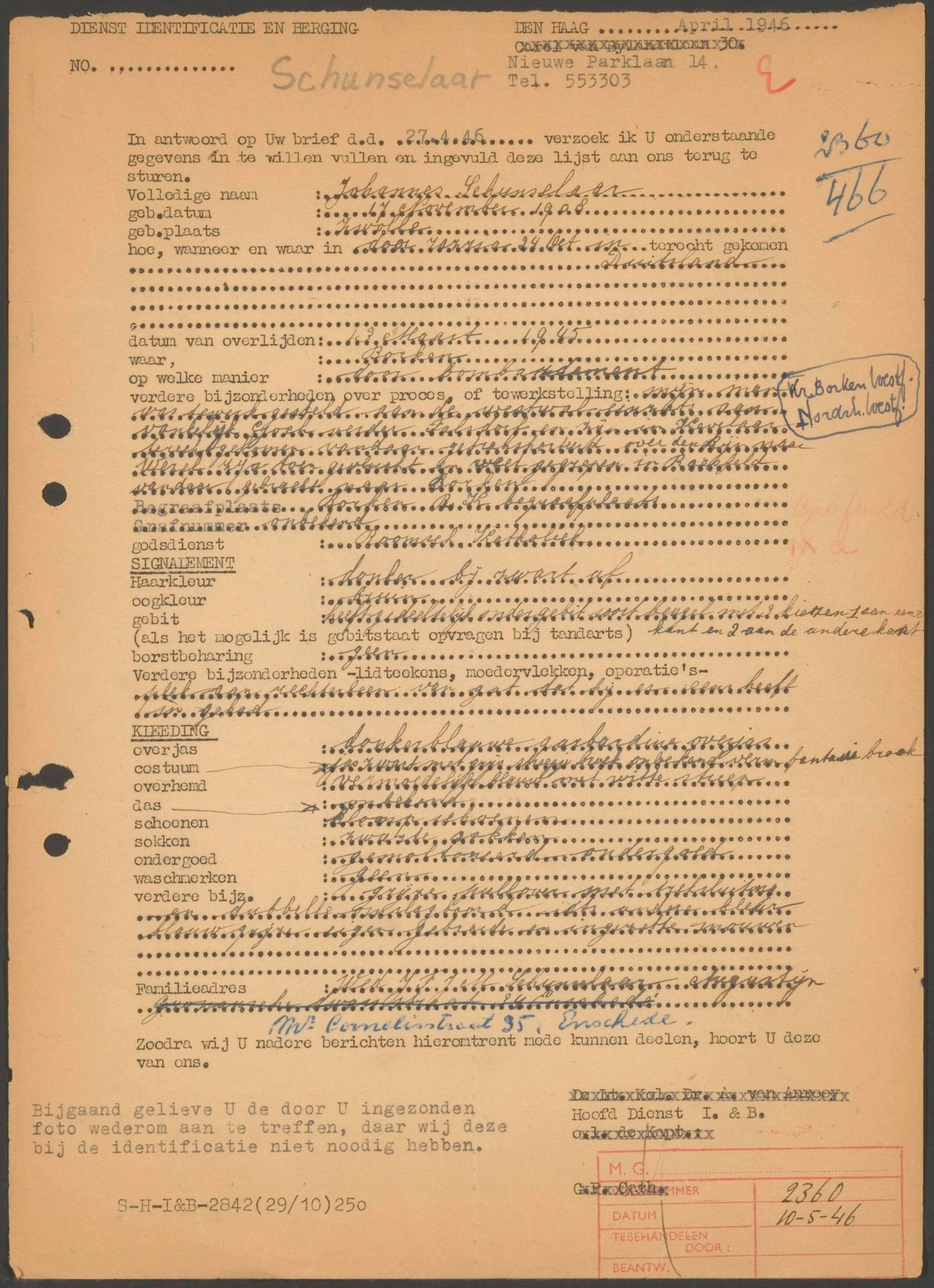 Gronausedwarsstraat 34 Johannes Schunselaar oorlogsslachtoffer brief dienst indentificatie en berging april 1946.jpg