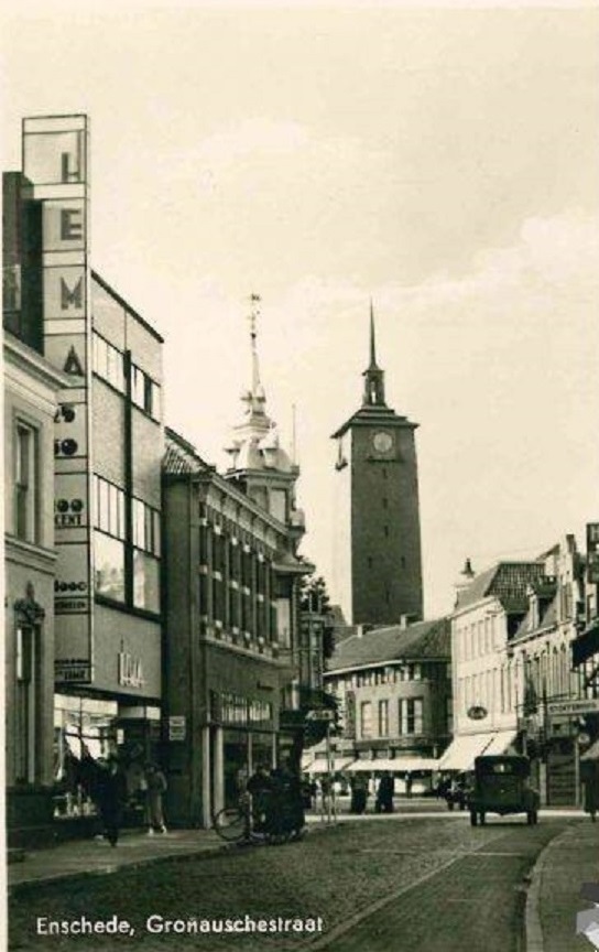 Het pand Magasin de Paris lederwaren van A. Bult op de hoek kruispunt De Klomp Gronausestraat 2 en Kalanderstraat is door een bombardement van 22-2-1944 geheel verwoest. zie krantenbericht Tubantia 17-10-153. Eerder zat in dit pand cafe De Top. Later zat op die hoek de Hema.