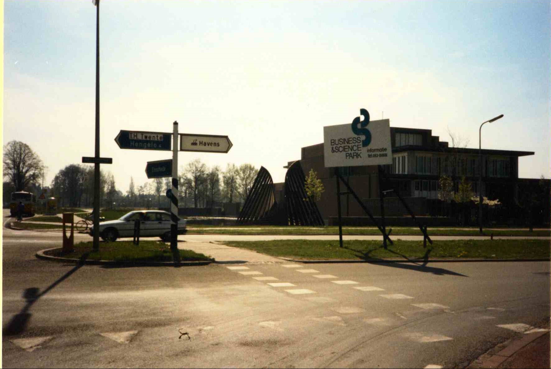 Hengelosestraat Nederlandsche Bank ter hoogte van Business & Sciencepark kunstwerk Waaier van Evert Strobos.