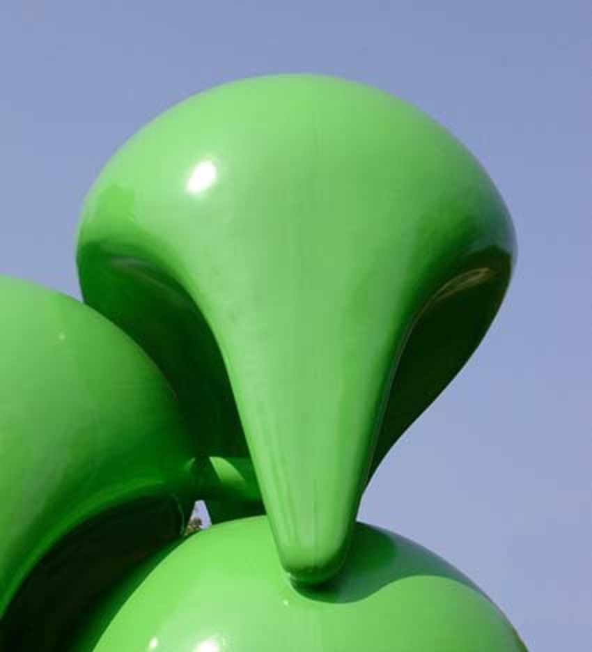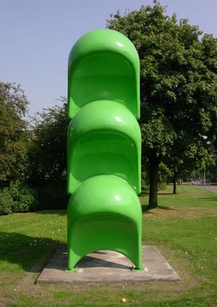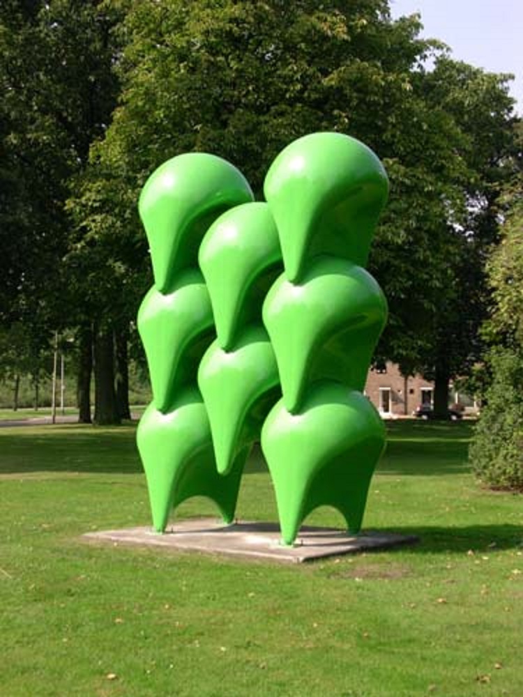 Spoordijkstraat thv de Toekomststraat kunstwerk Stapeling van groene druppelvormen van H. Schuring.