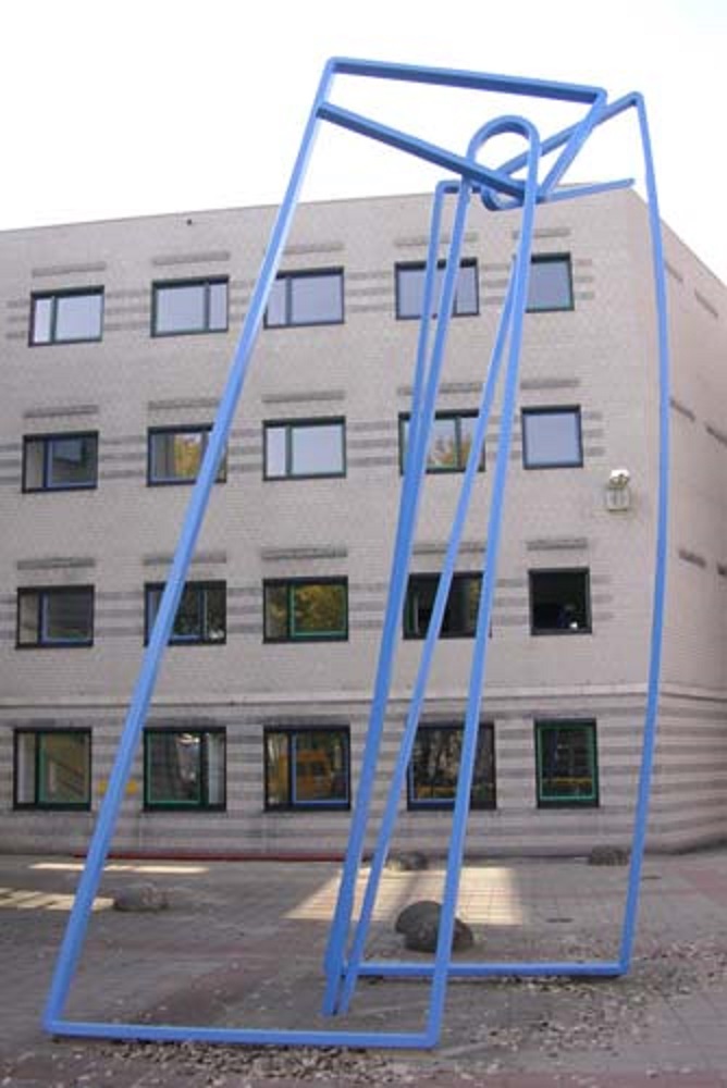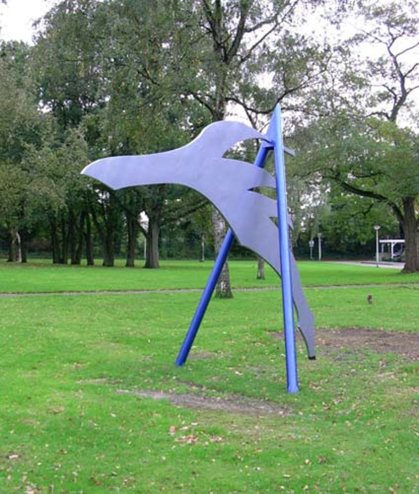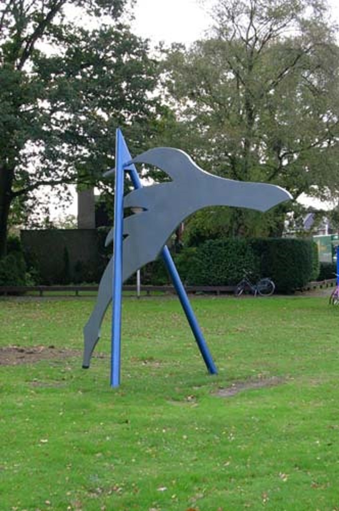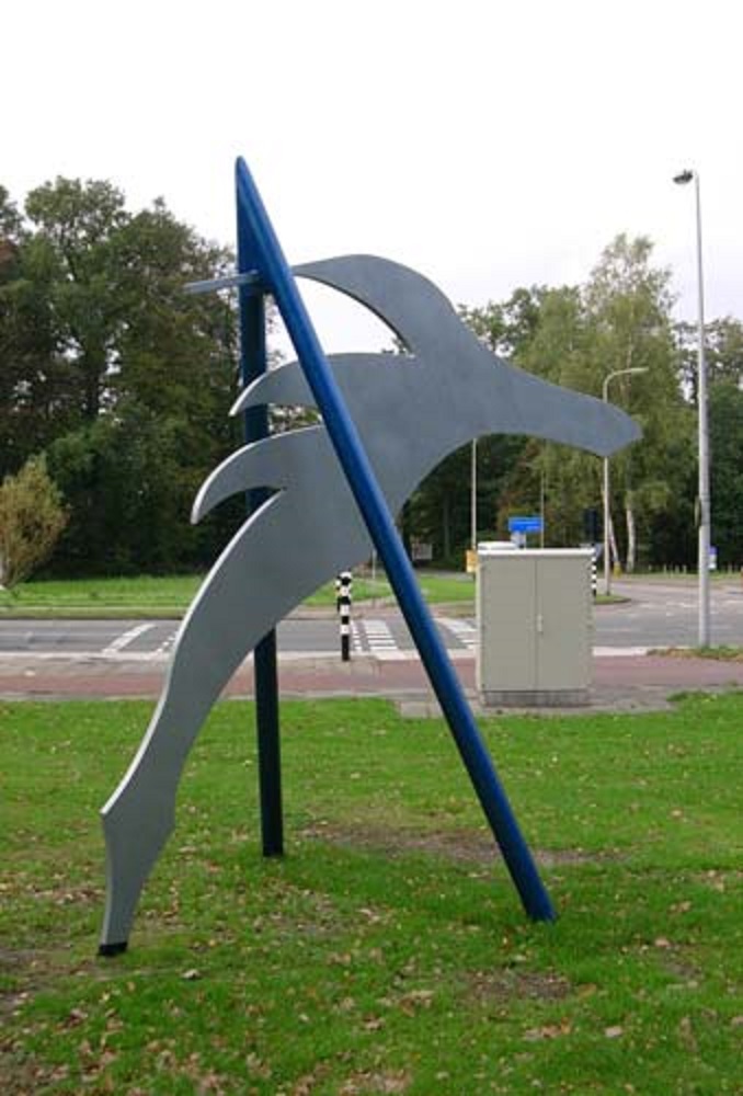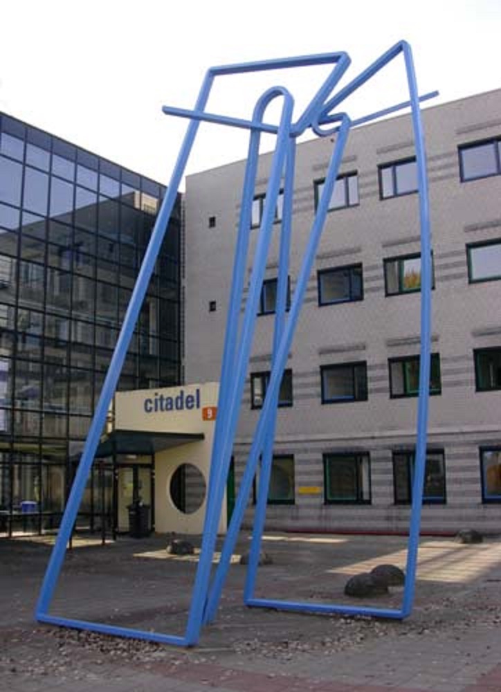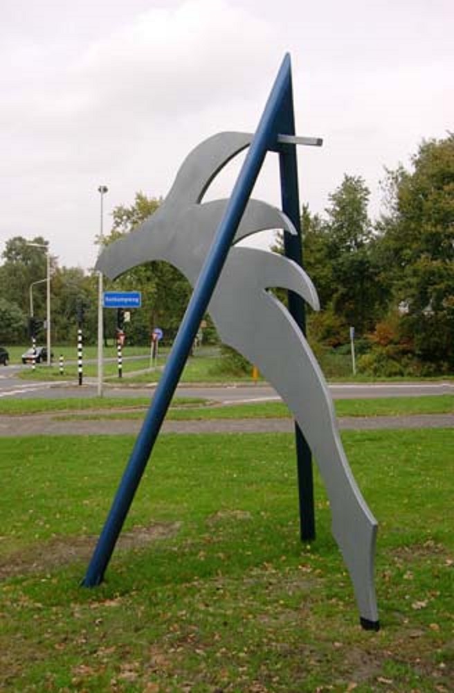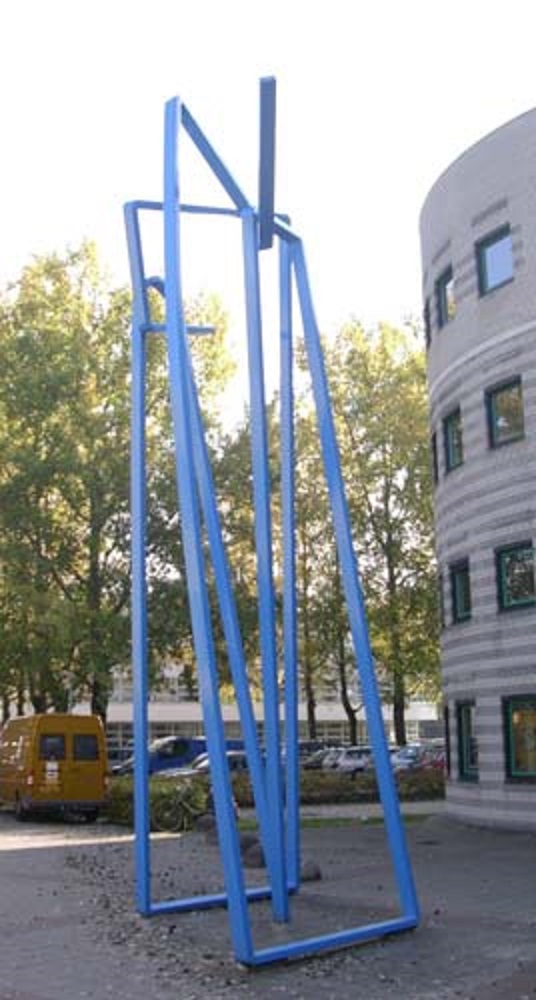 Marijke de Goey is een beeldhouwer en ontwerper die geworteld is in de typisch Nederlandse traditie van geometrische helderheid: lijnen en rechthoeken zijn de primaire vormen in haar werk. Zij heeft veel kunstwerken in de openbare ruimte gerealiseerd maar ontwerpt ook sieraden en interieurs voor treinen van de Nederlandse Spoorwegen. Bijna al haar beelden in de buitenruimte zijn blauw gelakt. Aangezien deze beelden vaak uit ijle lijnen bestaan is belangrijk voor de zichtbaarheid dat ze een kleur hebben die niet in de omgeving voorkomt. In Nederland is zijn de seizoenen sterk wisselend van kleur: de lente is lichtgroen, de zomer geel, de herfst rood en de winter grijs en bruin. Blauw is dan de enige kleur die altijd opvalt. Dat blauw moet wel helder zijn, want minder harde tinten vallen weg tegen de grijsblauwe luchten van Nederland. Voor dit pleintje heeft zij het beeld ’Tangodansers’ ontworpen. Het is 8 meter hoog en bestaat uit twee inelkaar gedraaide ijzeren rechthoeken, gelakt in de heldere kleur blauw die in sommige kringen al ’marijkeblue’ wordt genoemd. bron: http://www.kunstnonstop.nl/collectie/de ... 1StjDpLimw