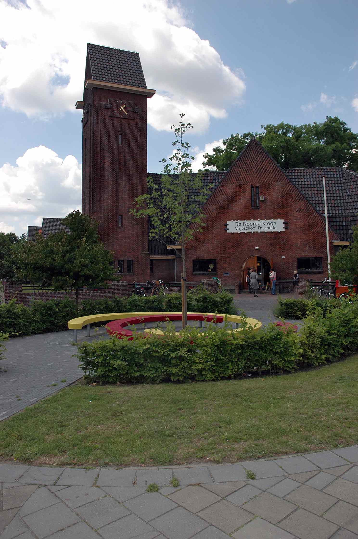De Noorderkroon is sinds 2000 in gebruik als schoolgebouw van de Vrije School. Het is gebouwd vóór de Tweede Wereldoorlog, in de stijl van de Amsterdamse School. Het gebouw staat onder monumentenzorg en is gelegen aan het kruispunt van de Jupiterstraat en de Olieslagweg. In het kader van het initiatief “Buurt in Actie” hebben de Noorderkroon en wijkbewoners in goede samenwerking vorm gegeven aan het opknappen van het perkje voor de school. Het plaatsen van een kunstwerk in de vorm van een spiraalnevel maakte deel uit van deze herinrichting van het groen. Dit idee is vervolgens uitgewerkt en gerealiseerd in samenwerking met de Noorderkroon, de buurtbewoners, bewoners uit de wijk Twekkelerveld, kunstenaar Jeroen Hoogstraten en de gemeente Enschede. Het kunstwerk is een kleurige, in hoogte variërende zitbank in de vorm van twee, in elkaar draaiende spiralen, naar voorbeeld van het melkwegstelsel. De Kosmosbank is een kunstwerk van kunstenaar Jeroen Hoogstraten in de wijk Twekkelerveld, meer in het bijzonder in het gedeelte dat bekendstaat als “de sterrenbuurt”. Het is door de gemeente Enschede gefinancierd. Door de symmetrische vorm zijn er twee ingangen van de bank; één ingang vanaf de school, en één ingang vanaf de straat. Bij de ingang vanaf de school begint de bank met een zithoogte voor kinderen en loopt dan op tot een volwassen zithoogte, en bij de ander is dat juist andersom. Het is geplaatst in een door de gemeente prachtig, nieuw aangelegd hofje met een tulpenboom in het midden. bron: http://www.kunstnonstop.nl/collectie/de ... 1b4tTpLimw