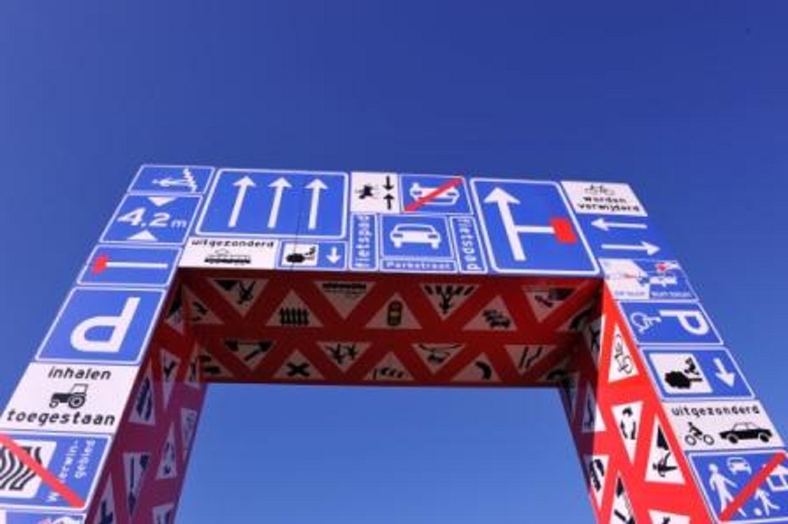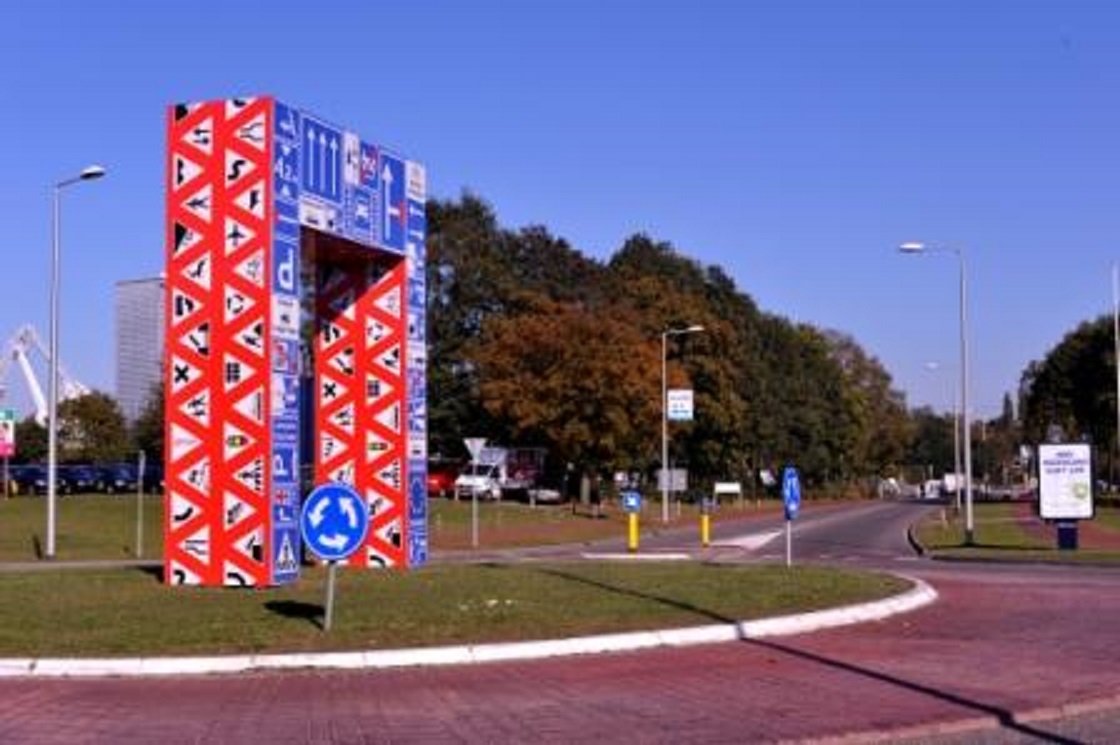 Als gevolg van een herstructurering in het havengebied is een rotonde aangelegd op de kruising van de Hendrik ter Kuilestraat met de Binnenhaven / Rembrandtlaan. Onderdeel van de herstructurering was ook een kunstopdracht. De gemeente Enschede heeft in samenwerking met omwonenden en de Belangenvereniging Ondernemers Havengebied een kunstopdracht geformuleerd. De vraag was om de vitaliteit van de haven zichtbaar te maken en daarbij een relatie te leggen met water, transport, werk en bedrijvigheid. Merijn Bolink heeft als basis van zijn ontwerp de poortgedachte, als markering van de rotonde als overgangsgebied tussen bedrijventerrein en woongebied. Met de Nederlandse overregulering in gedachten heeft Merijn zijn poort uit outer verkeersborden opgetrokken, waarin de kleuren rood en blauw domineren. bron: http://www.kunstnonstop.nl/collectie/de ... 1l1vjpLimw