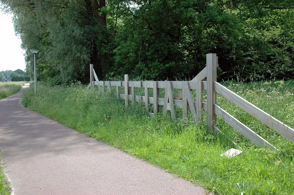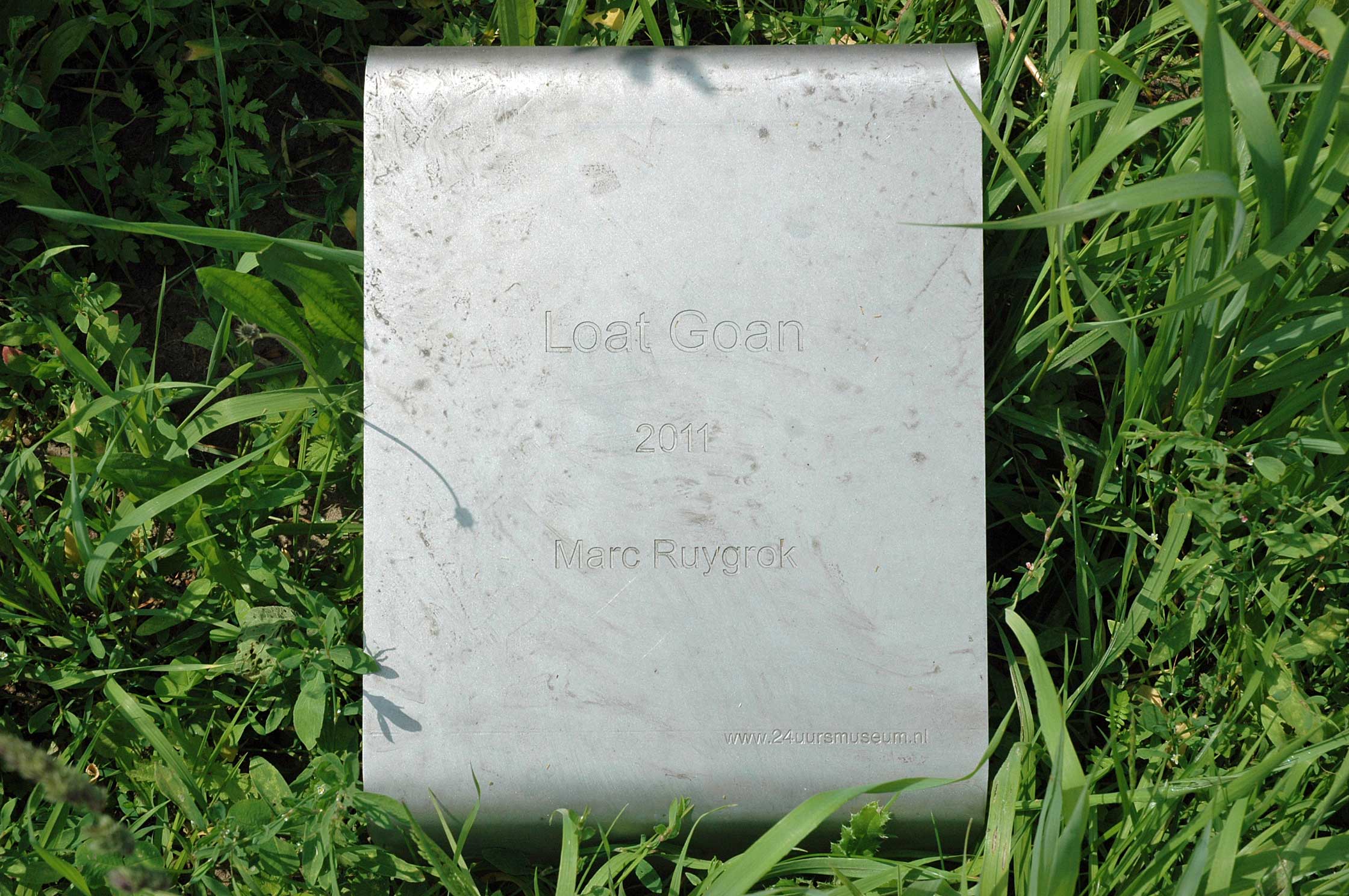 Het boerenhek, dat parallel ligt aan het fietspad aan de Oostweg, wordt hier onder meer als 'poort' tussen natuur en bebouwingscultuur ingezet. Het wordt zodoende visueel een zachte overgang van de natuur naar de bebouwing en omgekeerd. Het manifesteert zich in eerste instantie als boerenhek tegen het groene decor. Op het moment dat de tekst visueel te veel afsteekt tegen de overige houtconstructie is het geen boerenhek meer. Dit steekt zeer nauw. Pas in tweede instantie dient men de tekst te kunnen lezen. Het gaat dan ook niet om de waan van de dag maar om een beeld dat wij al kennen uit de gecultiveerde natuur. Boerenhekken hebben een interessante streekgebonden typologie. De twee hekken zijn ieder 6 à 7 meter lang en 1,25 meter hoog en vervaardigd uit de houtsoort Padoek. Een rossige gegarandeerd duurzaam gekweekte hardhoutsoort die op termijn zilverachtig van kleur wordt. LOAT GOAN is de ultieme twentse uitdrukking om dingen hun gang te laten gaan zonder verzet of weerstand te bieden. Het gaat zoals het gaat. Wat dat betreft is het de aanvaarding van de verbinding/botsing tussen de natuur en de bebouwing. Het wil dit op subtiele wijze bewerkstelligen. Marc Ruygrok genoot zijn opleiding aan de Rijksakademie van Beeldende Kunsten in Amsterdam en Ateliers '63 in Haarlem. Sinds de jaren tachtig kenmerken monumentale letters en woorden zijn plaatsgebonden beeldhouwwerk. bron: http://www.kunstnonstop.nl/collectie/de ... 2BKVjpLimw