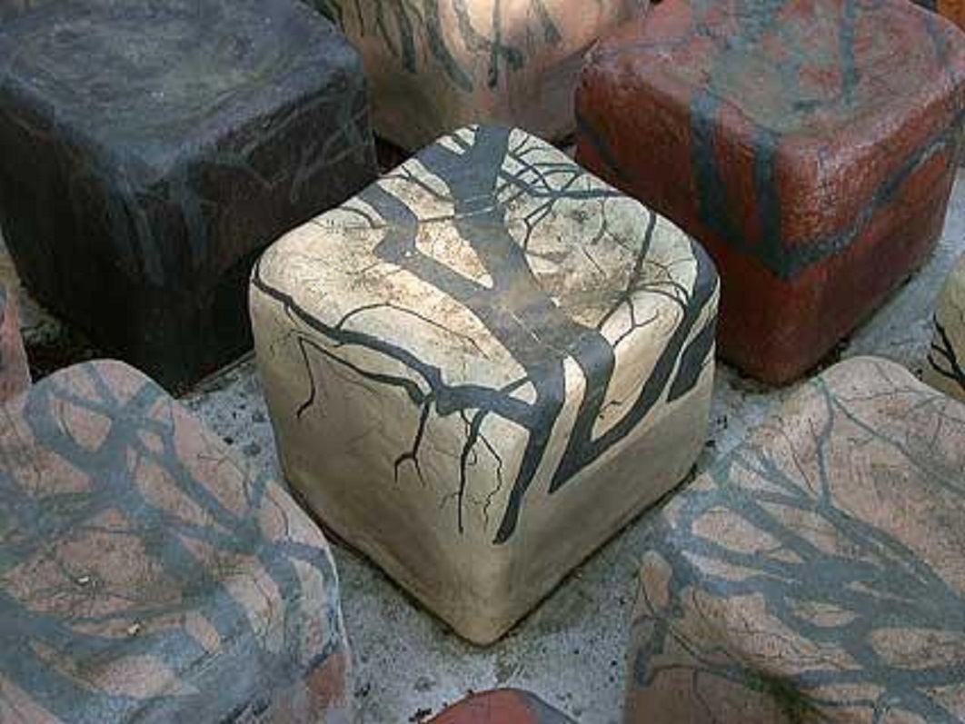 Waalstraat, thv de Geulstraat kunstwerk 49 Keramieken kubussen, beschilderd met boomotieven van kunstenares Sandra Mudde.