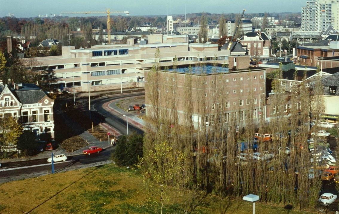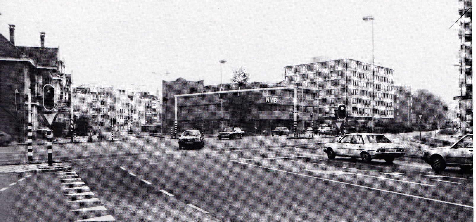 Haaksbergerstraat 60-66 Links de villa's vanaf de hoek Ripperdastraat en linksmidden het politiebureau. in het midden is nog een klein deel over van textielfabriek Nijverheid. Rechts NMB bank 1986.jpg