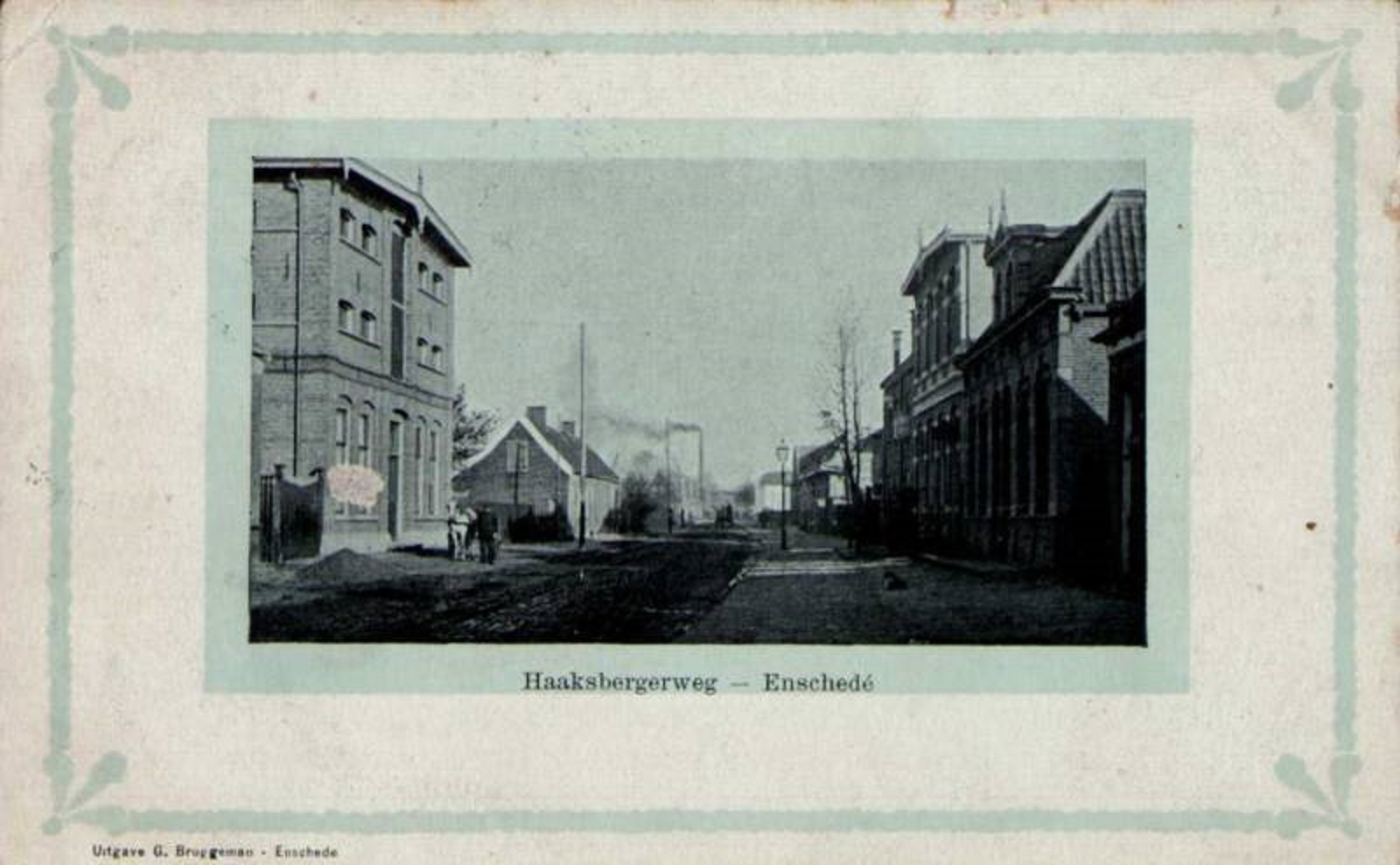 Haaksbergerstraat 71 vroeger Haaksbergerweg cafe Bezoen later Hammink rechts naast oude fabriek Scholten.  links koffiebranderij Kamp (Seinhorst) ca 1900.jpg