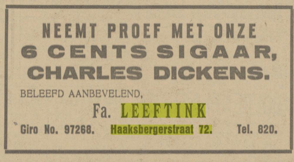 Leeftink H.J. sigarenwinkel Haaksbergerstraat 72 advertentie 26-11-1920 en 19-5-1923