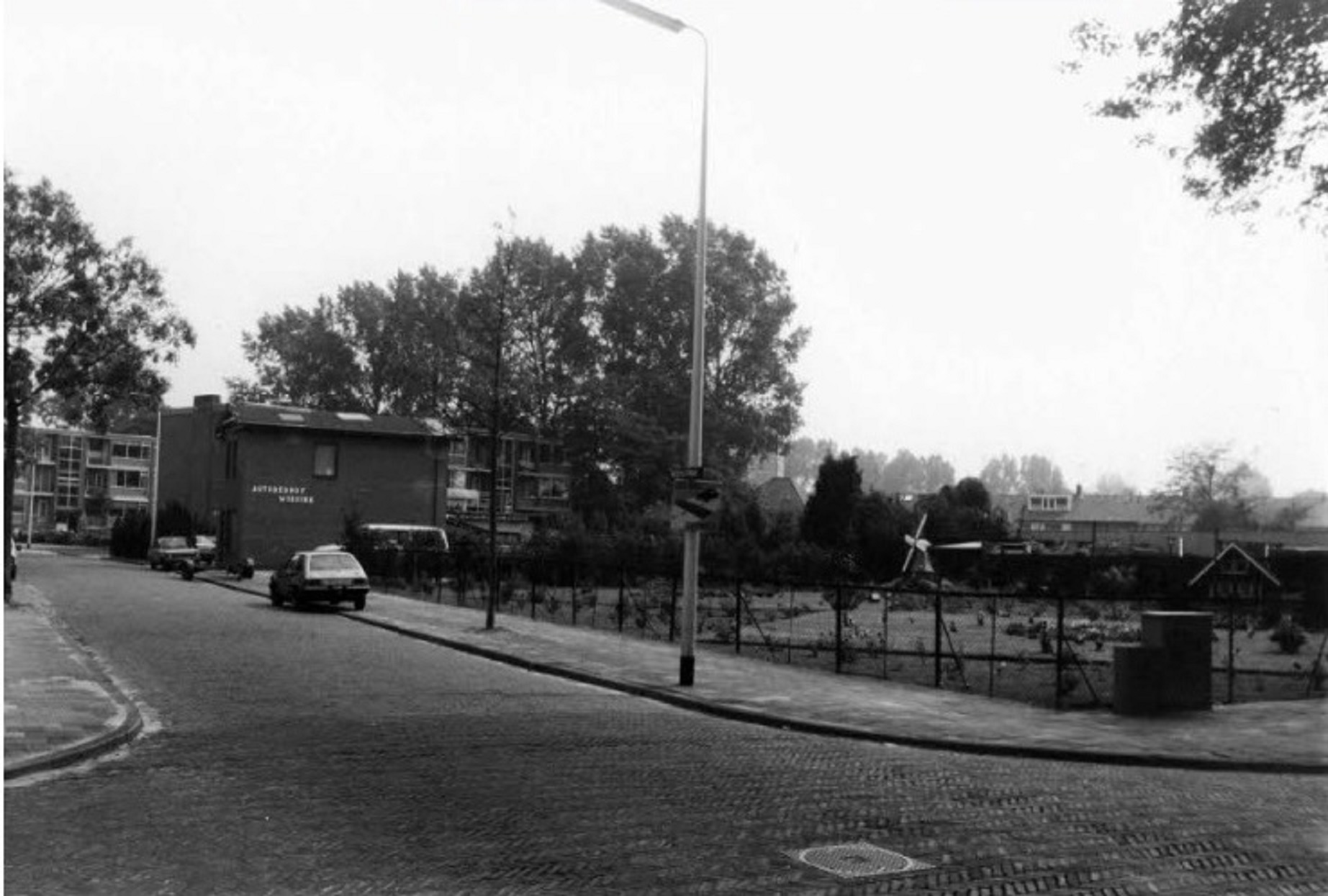 Helenastraat nabij kruising met de Jacobastraat met autobedrijf Wissink, rechts tuin van woning vol tuinkabouters 1988.jpg