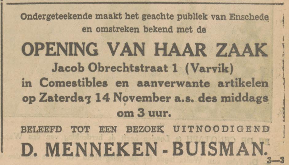 Menneken, E. Kruidenier, bakker, Jac. Obrechtstraat 1