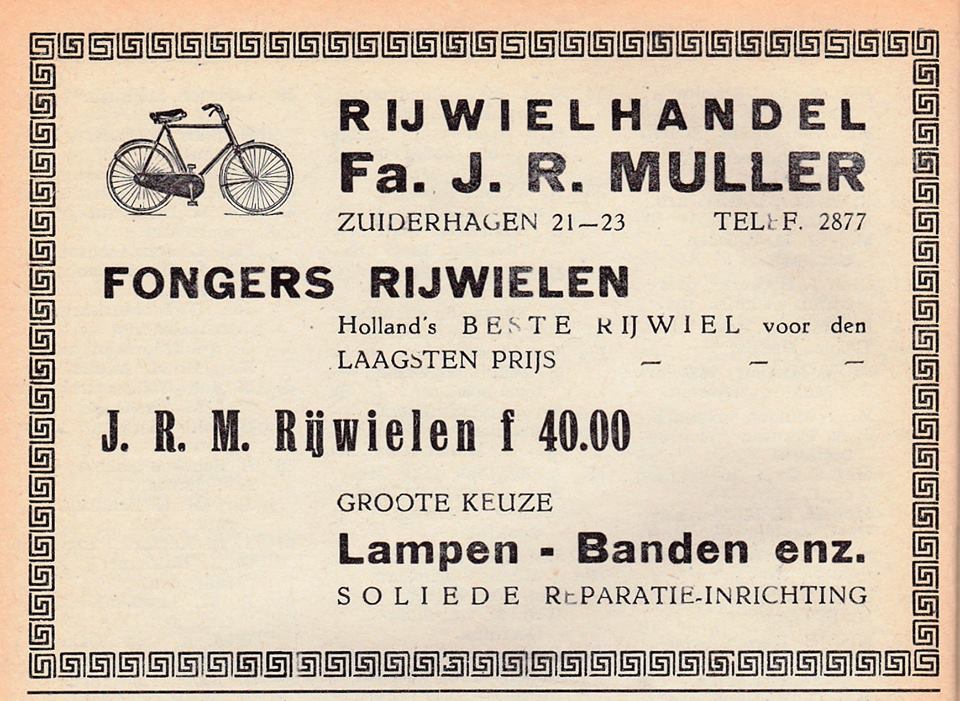 Zuiderhagen 21-23 Rijwielhandel J.R. Muller voorheen P. Hut advertentie Tubantia 26-5-1919.