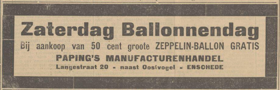 Een oude advertentie van Paping Manufacturenhandel aan de Langestraat uit de Tubantia van 22-3-1935. Nu is Paping bezig met een opheffingsuitverkoop.