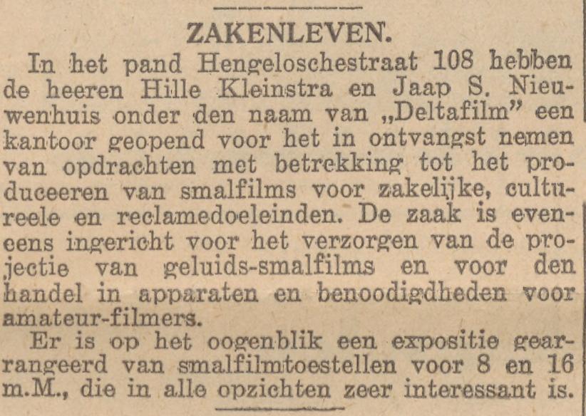 Kleinstra H. fotograaf Hengelosestraat 108 krantenbericht 2-11-1938