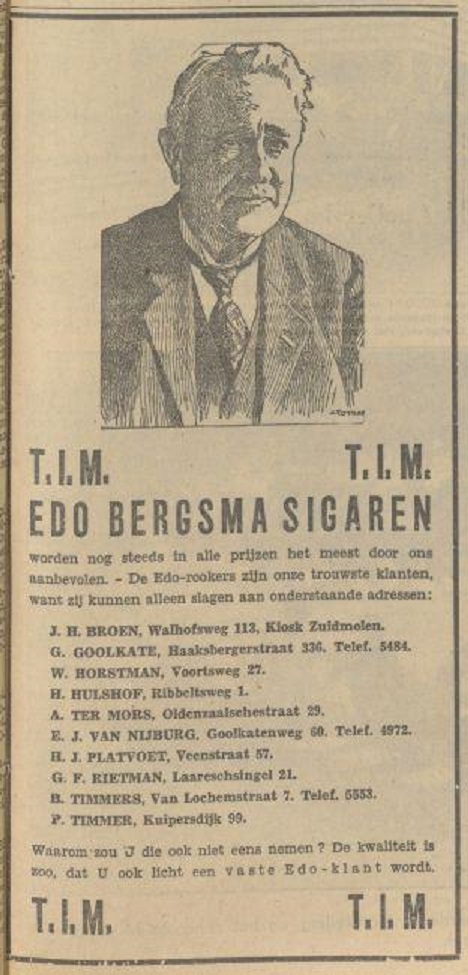 Nooit geweten dat Burgemeester Edo Bergsma een eigen sigarenmerk had. advertentie Tubantia 16-6-1934