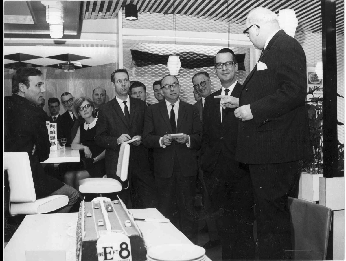 van Loenshof 15  interieur van AC restaurant met daarop een groep personen en dhr. G. J. Heijn i.v.m. de opening. Een taart met daarop de weg aanduiding E 8. 11-5-1966.jpg