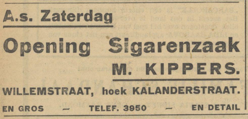 Willemstraat hoek Kalanderstraat sigarenzaak M. Kippers advertentie Tubantia 30-8-1935.