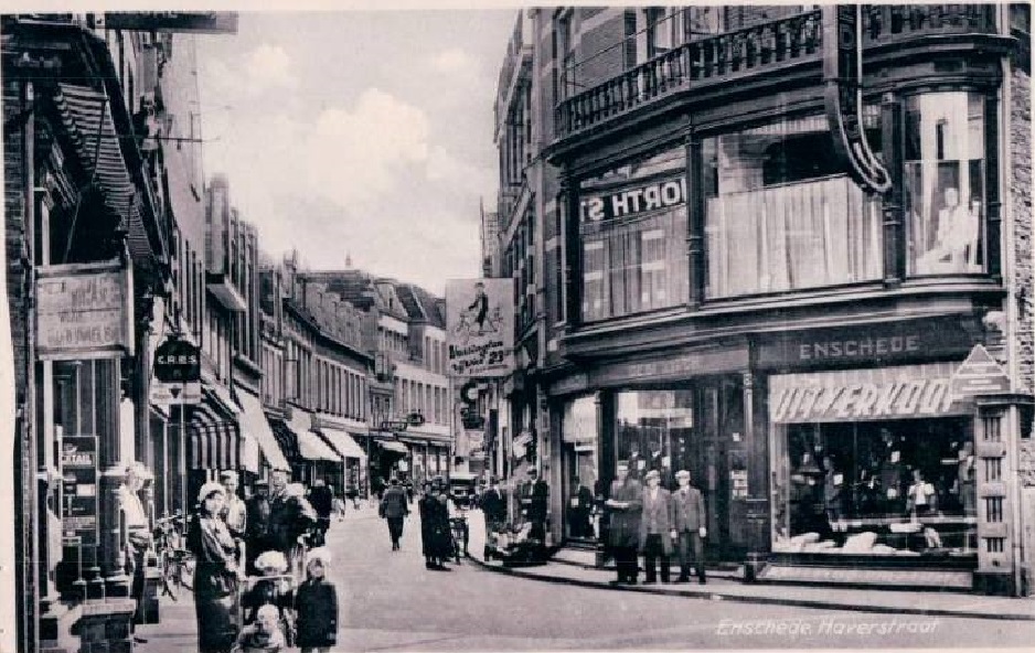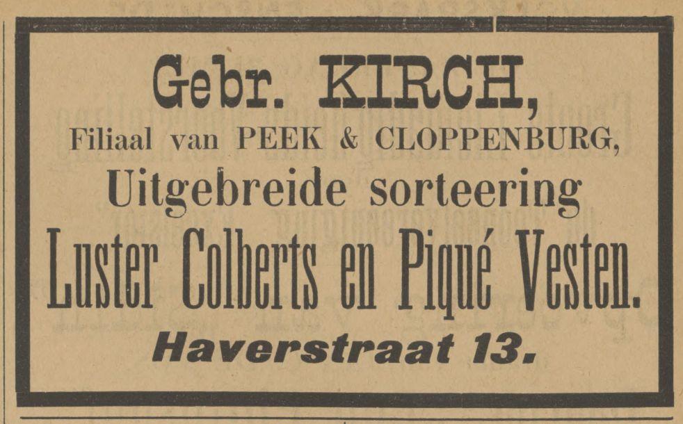 Haverstraat 13 Gebr. Kirch Filiaal van Peek en Cloppenburg advertentie Tubantia 31-5-1902. Later werd het Kirch's Berconhuis aan de Haverstraat 23.