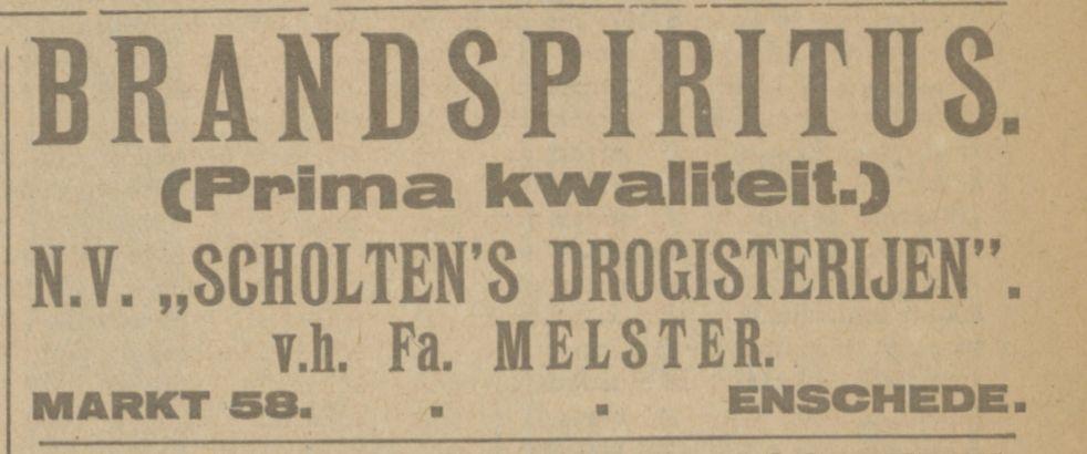 Hierbij 4 advertenties uit de Tubantia van 3-6-1914, 12-7-1916, 14-9-1921 en 19-9-1923 van de Firma Melster later N.V. Scholten's Drogisterijen aan de Markt 58. Ik heb geen foto kunnen vinden van het pand Markt 58.