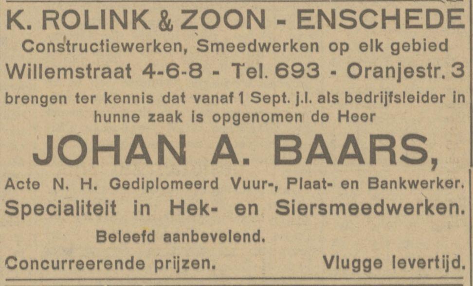 Willemstraat 4-8 K. Rolink & Zoon smeedwerken advertentie Tubantia 15-9-1926.